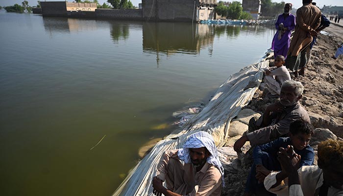 Flood-affected people gather by an embankment in Mehar city after heavy monsoon rains in Dadu district, Sindh province on September 9, 2022. — AFP/File