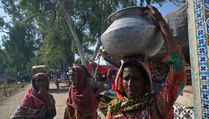 Internally displaced flood-affected women carry water pots at a makeshift camp in Mehar city after heavy monsoon rains in Dadu district, Sindh province on September 9, 2022. — AFP/File